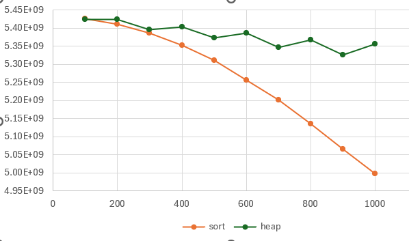 It’s interesting, but I have not investigated, why the heap implementation seesaws back and forth for ‘odd’ values (k=600 is slightly faster than k=500, for example).