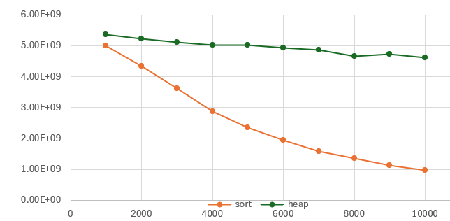 10000 0.97 4.62 378%For k=10000, the heap is 4.78x faster, and the performance disparity continues to diverge.