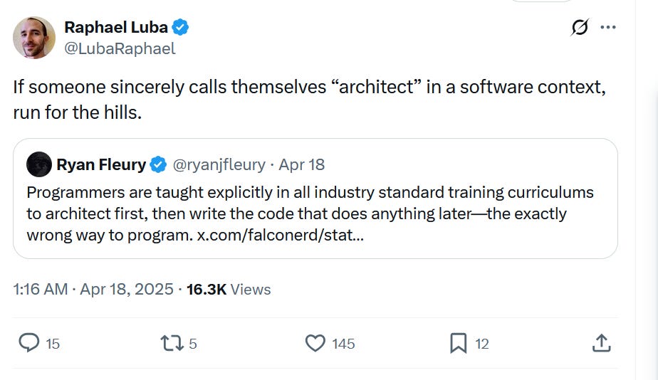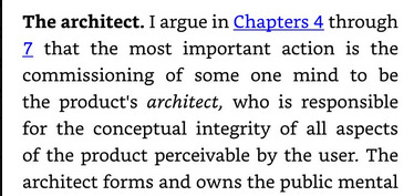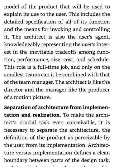This may be true in some contexts—just do a LinkedIn search for Software Architect to see why—but it doesn’t change an ancient truth about our profession: As Fred Brooks pointed out 50 years ago in The Mythical Man Month, it always has been important to separate architecture and implementation. And he also emphasizes the value of that vision being carried out and conveyed by singular people instead of committees.